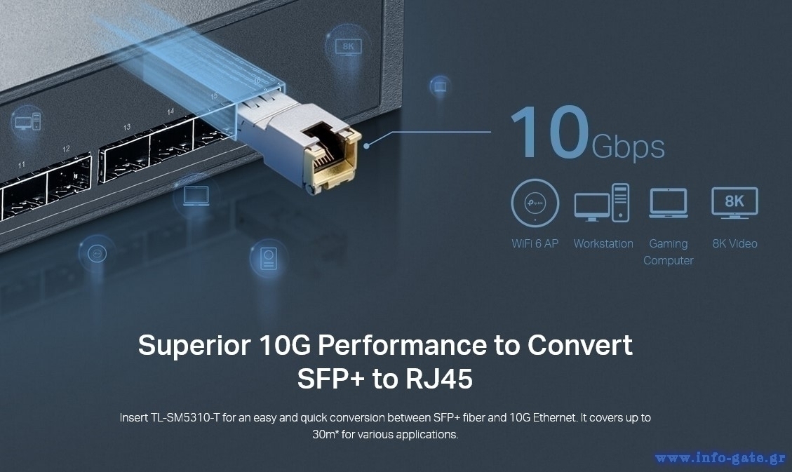 Το TL-SM5310-T παρέχει ανώτερη απόδοση 10G για εύκολη και γρήγορη σύνδεση μεταξύ της διεπαφής SFP+ και της θύρας RJ45. Καλύπτει έως και 30m* στα 10 Gbps (UTP cat.6a ή παραπάνω) . Ο σχεδιασμός plug-and-play διευκολύνει την ανάπτυξη, χωρίς να χρειάζεται τεχνικός. Το υψηλής ποιότητας μεταλλικό περίβλημα εξασφαλίζει αντοχή και αξιοπιστία για μεγάλο χρονικό διάστημα, διατηρώντας μια σταθερή σύνδεση σε ένα ευρύ φάσμα περιβαλλόντων.