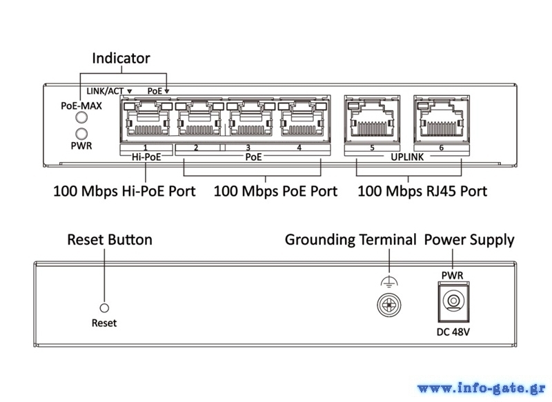 Port Number: 4x 100 Mbps PoE RJ45 port, and 2x 100 Mbps network RJ45 ports