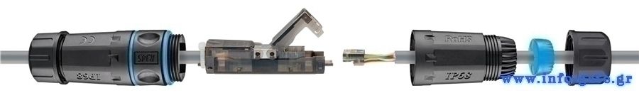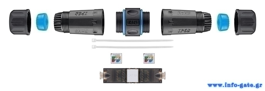 Αδιάβροχος σύνδεσμος καλωδίου RJ45 Cat 6A, ιδανικός για συνδέσεις ethernet σε εξωτερικούς χώρους. Προσφέρει αδιαβροχοποίηση επιπέδου IP68, προστατεύοντας την συνδεσμολογία από σκόνη και νερό. Εγκαθίσταται εύκολα και γρήγορα και είναι συμβατό με καλώδια διαμέτρου 5-7.5mm.
