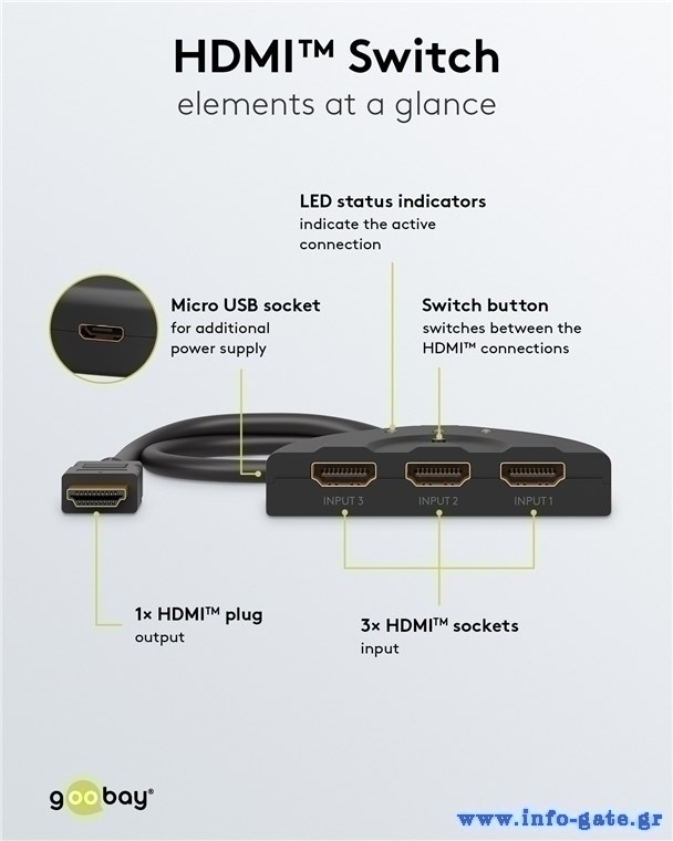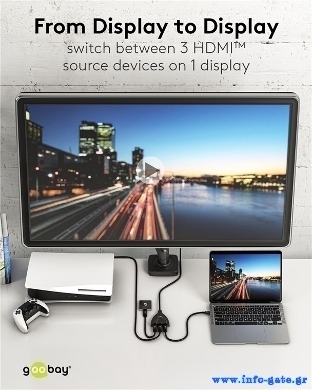 Το HDMI switch της Goobay σας επιτρέπει την εύκολη εναλλαγή μεταξύ 3x συσκευών εισόδου όπως PC ή gaming κονσόλες σε 1x συσκευή εξόδου όπως οθόνη ή τηλεόραση. Η εναλλαγή γίνεται μέσω πλήκτρου.