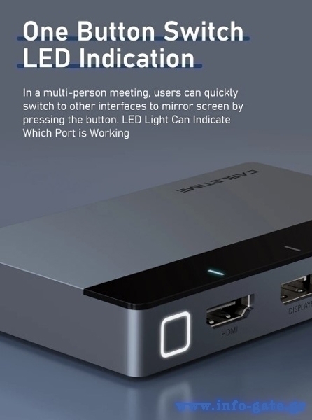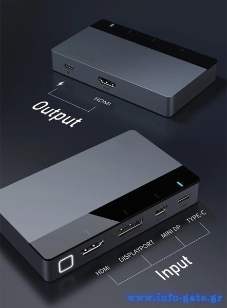 Το multi-port switch CT-PS41-GB1 της Cabletime σας επιτρέπει την εύκολη εναλλαγή μεταξύ 4x συσκευών εισόδου μεσώ θύρας USB-C, HDMI, DisplayPort και Mini DisplayPort σε 1x συσκευή εξόδου μεσώ θύρας HDMI.