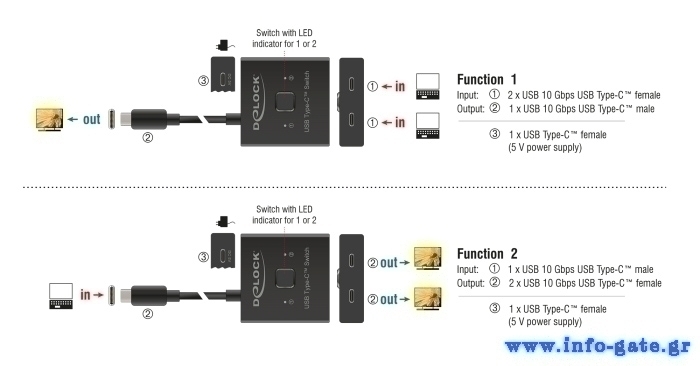 -Βύσμα 2: 2x USB-C 10Gbps θηλυκό, 1x USB-C θηλυκό τροφοδοσίας (5V PD)