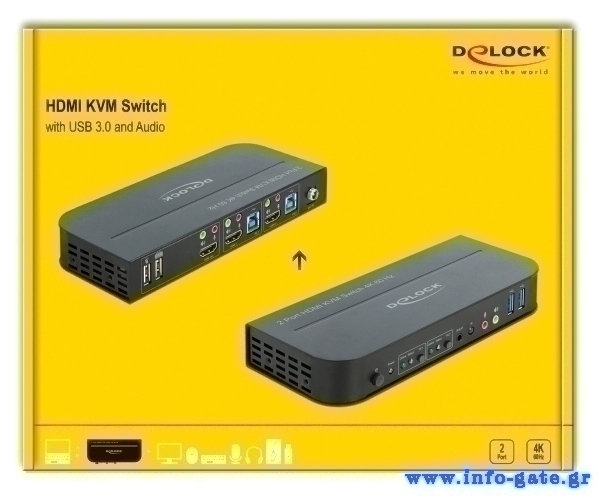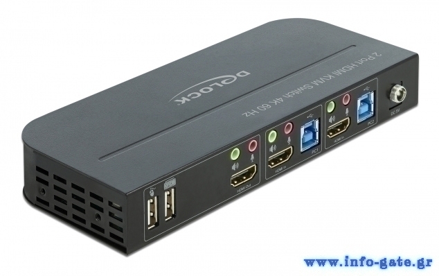 Το HDMI KVM Switch της Delock αποτελεί μια εύκολη λύση για τη σύνδεση δύο υπολογιστών με καλώδιο εξαγωγής HDMI σε μια οθόνη HDMI. Επιπλέον, διαθέτει δύο θύρες USB 2.0 για σύνδεση με ποντίκι και πληκτρολόγιο και δύο θύρες USB 3.0 για σύνδεση με σκληρό δίσκο ή κάρτα μνήμης USB. Ο ενεργός υπολογιστής μπορεί να επιλεχθεί με το ποντίκι, με το πληκτρολόγιο, με κουμπί στη συσκευή ή με τηλεχειριστήριο υπερύθρων.