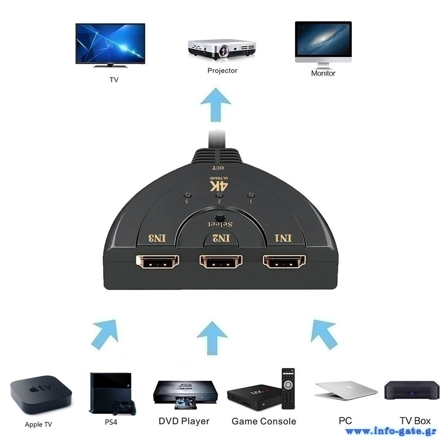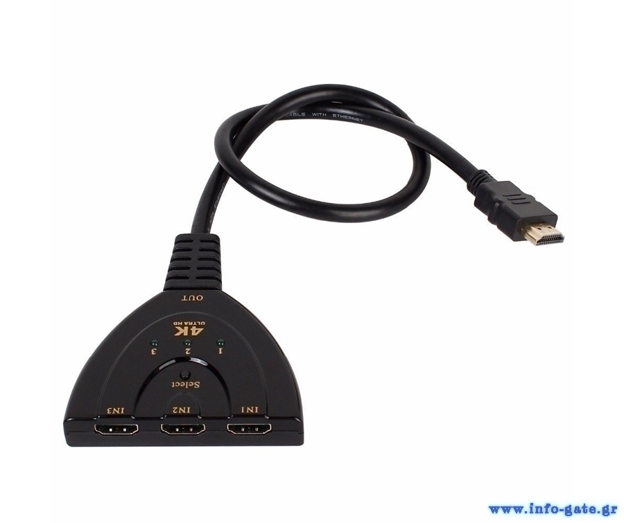 O 3x 1 HDMI Switcher της Powertech λειτουργεί με τρεις εισόδους και μια έξοδο HDMI και μεταφέρει βίντεο υψηλής ευκρίνειας, σε πολλαπλές αναλύσεις μέχρι 4Κ x 2Κ @ 3048 και ψηφιακό ήχο απο τις 3 πηγές σε μια οθόνη υψηλής ευκρίνειας. Συμβατό με συσκευές αναπαραγωγής όπως HD-DVD, SKY-STB, PS3, Xbox360 κλπ. Διαθέτει κουμπί που επιτρέπει την εναλλαγή μεταξύ των συσκευών HDMI.