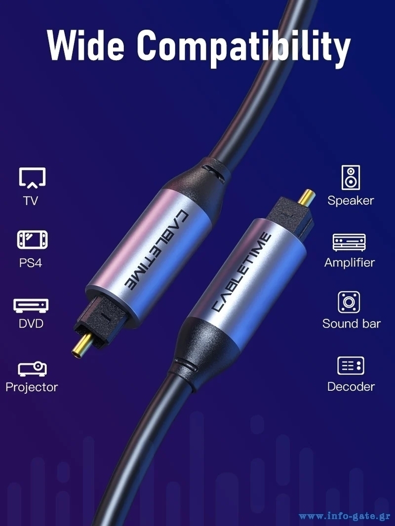 Καλώδιο toslink της Cabletime για καθαρή και υψηλής ποιότητας μεταφορά σήματος ήχου. Ιδανικό για τη σύνδεση συσκευών όπως gaming κονσόλες, HiFi συστήματα, home cinema, Blu-ray players, ενισχυτές ήχου κλπ.