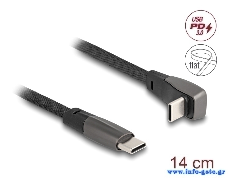 DELOCK καλώδιο USB-C 80750, 60W, flat, γωνιακό, 480 Mbps, 14cm, μαύρο
