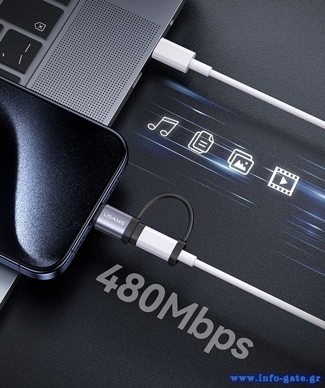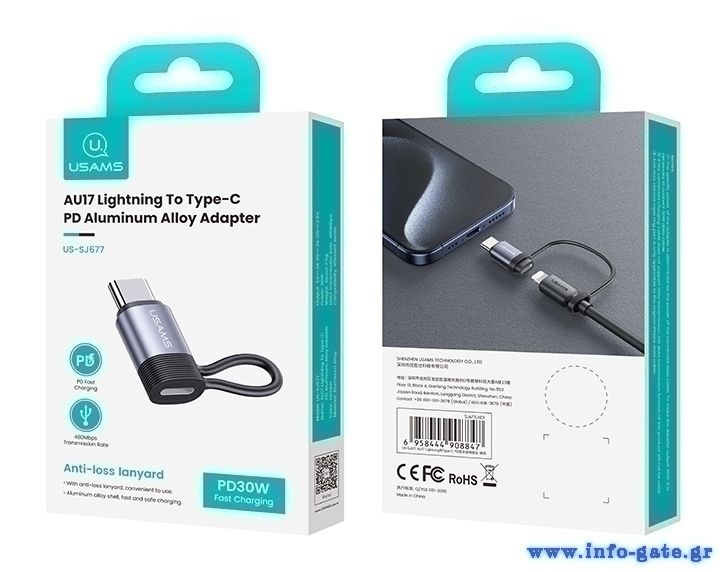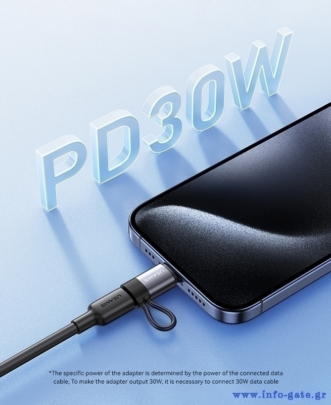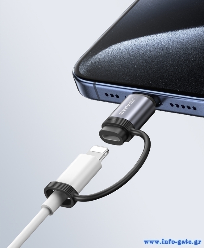 Aντάπτορας USB-C σε Lightning για φόρτιση και μεταφορά δεδομένων της Usams, με μέγιστη απόδοση φόρτισης 30W.