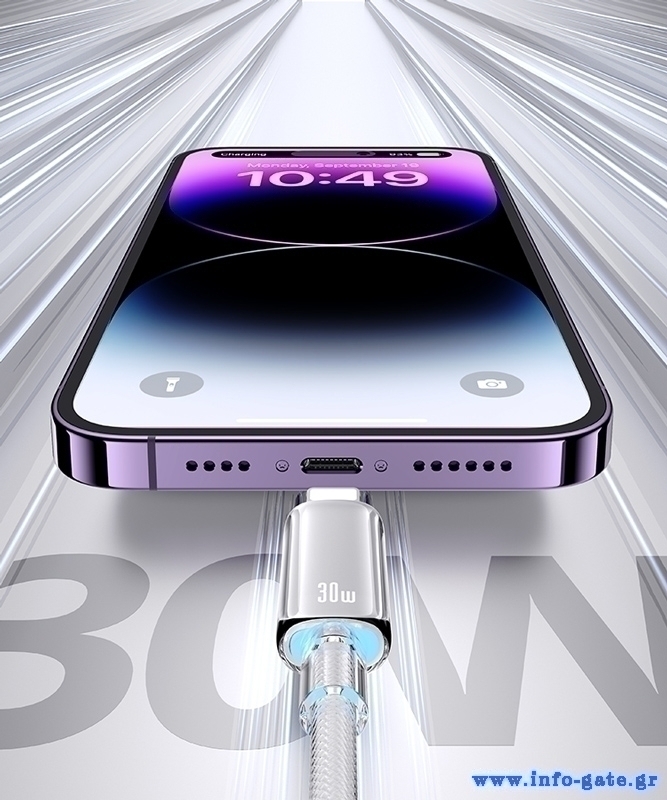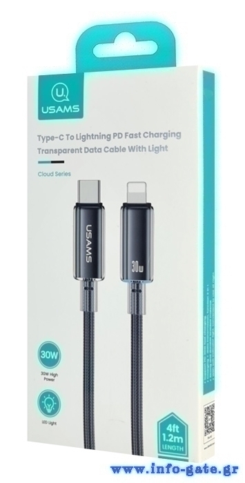 Καλώδιο φόρτισης και μεταφοράς δεδομένων Lightning σε USB-C της Usams. Υποστηρίζει φόρτιση με απόδοση έως 30W και μεταφορά δεδομένων με ταχύτητα έως 480Mbps.