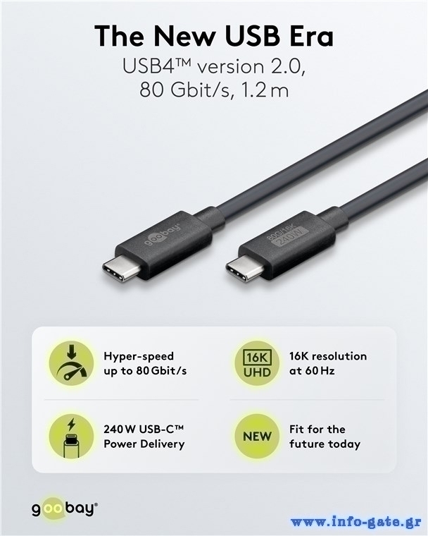 Καλώδιο USB-C της Goobay με εξαιρετικά γρήγορους ρυθμούς μεταφοράς δεδομένων έως 80Gbps και υψηλή απόδοση φόρτισης έως 240W.
