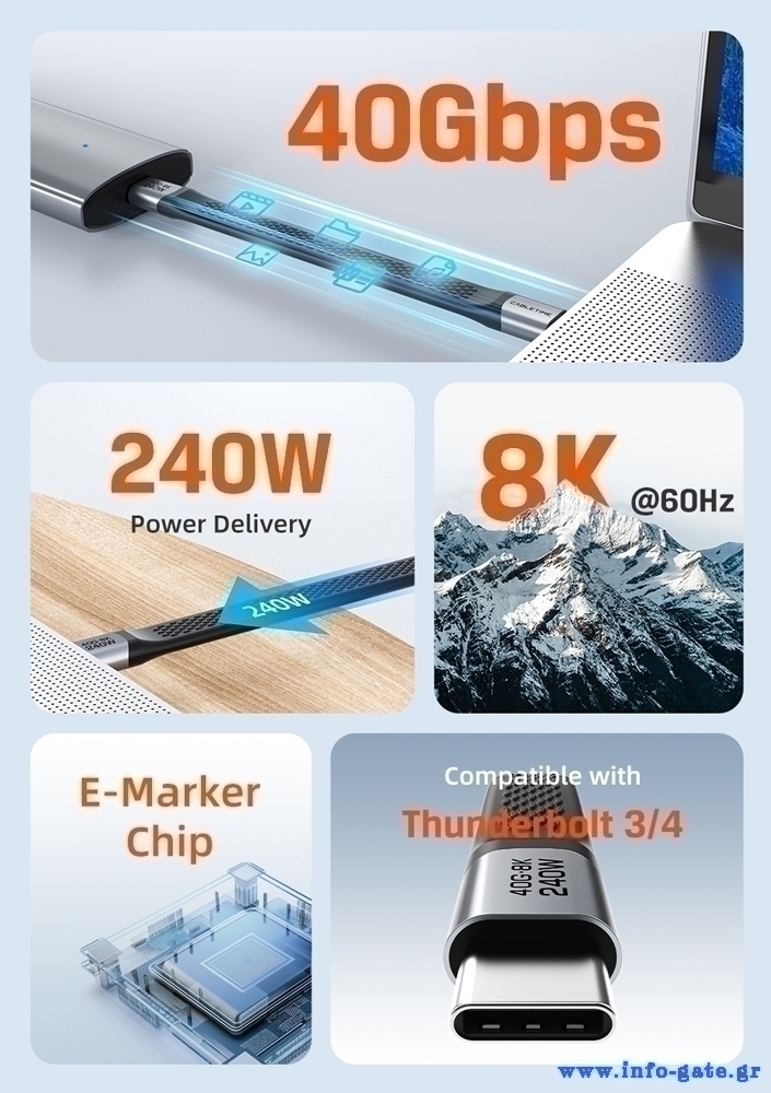Καλώδιο φόρτισης και μεταφοράς δεδομένων USB-C σε USB-C της Cabletime. Υποστηρίζει φόρτιση με απόδοση έως 240W, μεταφορά δεδομένων με ταχύτητα έως 40Gbps και μεταφορά εικόνας με ανάλυση έως 8K.