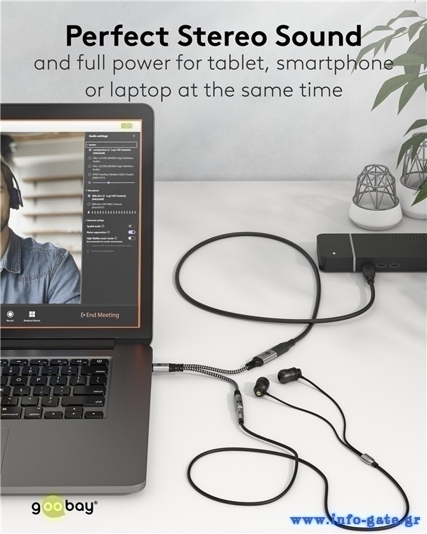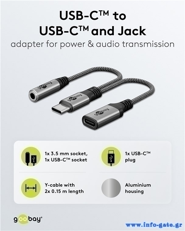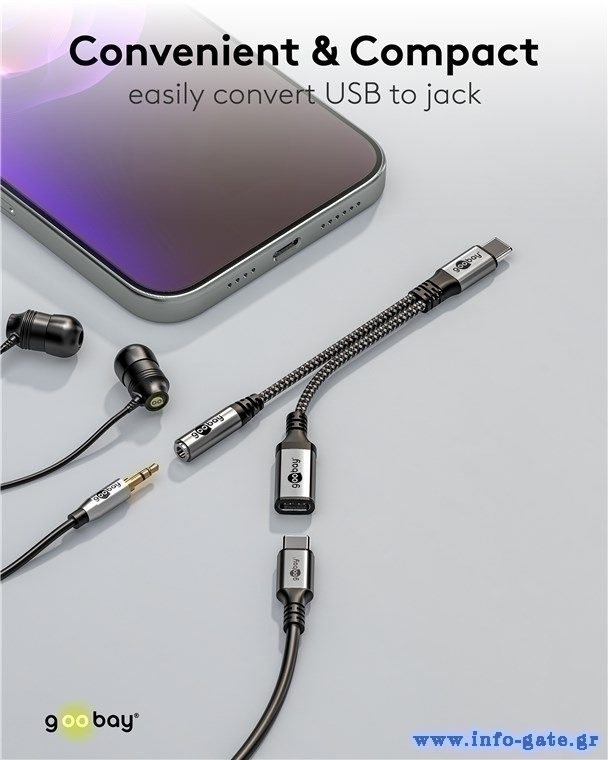 Aντάπτορας της Goobay ιδανικός για την σύνδεση ακουστικών με 3.5mm διεπαφή, μέσω θύρας USB-C. Διαθέτει επιπλέον υποδοχή USB-C που σας επιτρέπει να φορτίζετε την συσκευή σας, ακούγοντας παράλληλα την αγαπημένη σας μουσική.