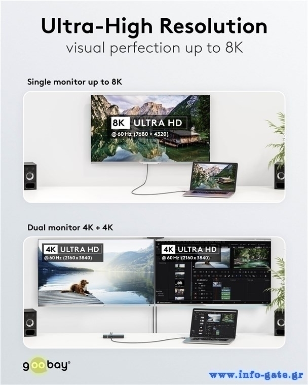 Το καλώδιο υποστηρίζει υψηλή ανάλυση 8K στα 60Hz και 4K στα 120Hz σε μια οθόνη, και 4K στα 60Hz όταν το σήμα μοιράζεται μεταξύ δύο οθονών μέσω ενός docking station.