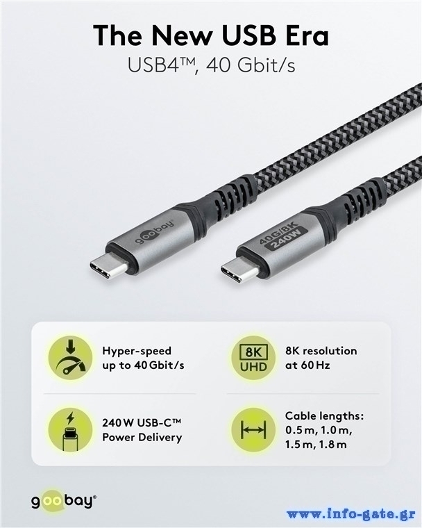 Καλώδιο USB-C της Goobay με εξαιρετικά γρήγορους ρυθμούς μεταφοράς δεδομένων έως 40Gbps και υψηλή απόδοση φόρτισης έως 240W.