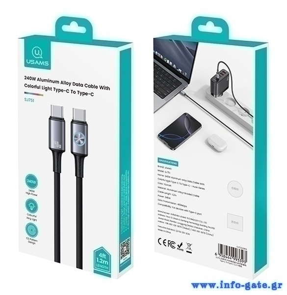 Καλώδιο φόρτισης και μεταφοράς δεδομένων USB-C σε USB-C της Usams. Υποστηρίζει φόρτιση με απόδοση έως 240W και μεταφορά δεδομένων με ταχύτητα έως 480Mbps.