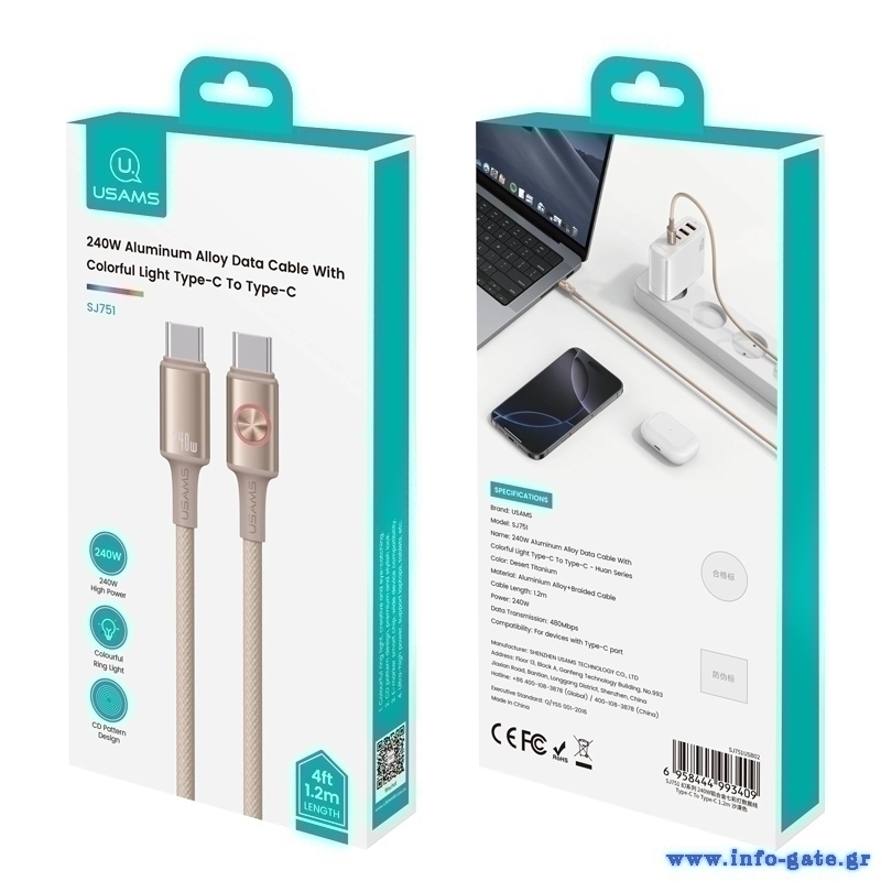 Καλώδιο φόρτισης και μεταφοράς δεδομένων USB-C σε USB-C της Usams. Υποστηρίζει φόρτιση με απόδοση έως 240W και μεταφορά δεδομένων με ταχύτητα έως 480Mbps.