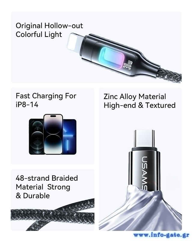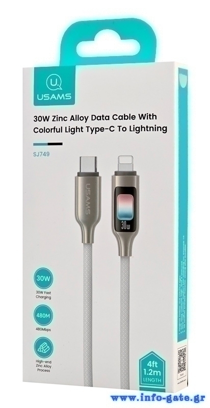 Καλώδιο φόρτισης και μεταφοράς δεδομένων Lightning σε USB-C της Usams. Υποστηρίζει φόρτιση με απόδοση έως 30W και μεταφορά δεδομένων με ταχύτητα έως 480Mbps.