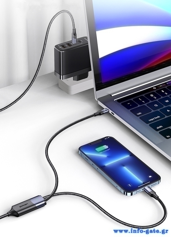 Καλώδιο φόρτισης και μεταφοράς δεδομένων USB-C σε 2x USB-C της Usams, με απόδοση φόρτισης έως 100W.