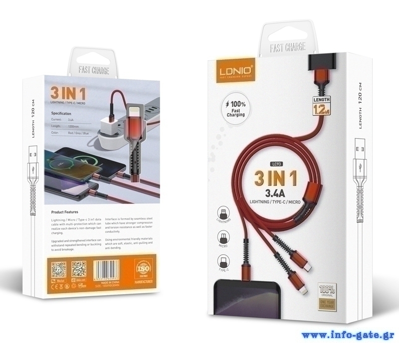 LDNIO καλώδιο USB σε USB-C/Lightning/Micro USB LC93, 3.4A, 1.2m, γκρι