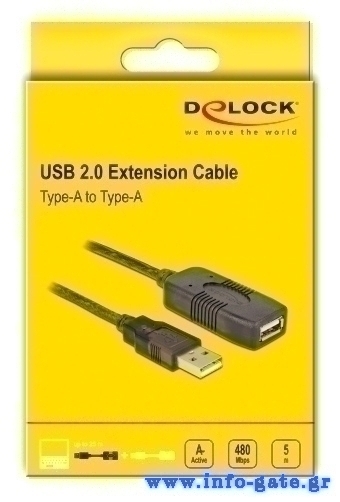 DELOCK καλώδιο USB 2.0 αρσενικό σε θηλυκό 82308, active, 5m, μαύρο
