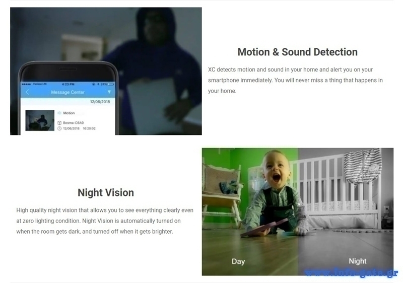 Η smart κάμερα XC της Bosma, καταγράφει κάθε κίνηση σε καθαρή, Full HD ανάλυση, ακόμη και κατά την διάρκεια της νύχτας. Ο ευρυγώνιος φακός σε συνδυασμό με τη λειτουργία περιστροφής 360° εξασφαλίζει ότι δεν θα υπάρχει τυφλό σημείο στον χώρο σας.