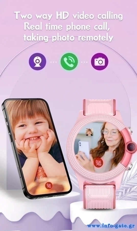 Εξοπλίζεται με έγχρωμη οθόνη αφής 1.28" και κάμερα 0.3 MP. Υποστηρίζει τηλεφωνικές κλήσεις ή βιντεοκλήσεις με δίκτυο 4G (με τη χρήση Nano SIM κάρτας) και διαθέτει και κουμπί για κλήσεις SOS σε περιπτώσεις έκτακτης ανάγκης.