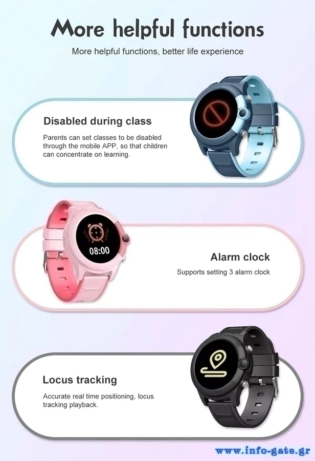 Others: Vibration,No disturbing time, SMS alerts(Low battery alert/SOS alert), Remote shutdown, Alarm clock, Watch finder, Math game, Class schedule,Camera,Calculator,Rewards,Stopwatch, etc.