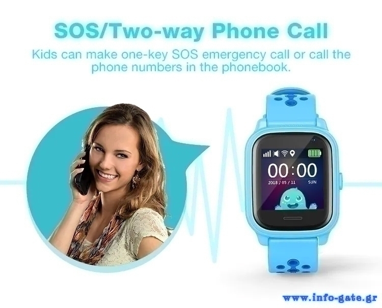 Εξοπλίζεται με έγχρωμη οθόνη αφής 1.33" και κάμερα 0.3 MP. Υποστηρίζει τηλεφωνικές κλήσεις με δίκτυο 2G (με τη χρήση Nano SIM κάρτας) και διαθέτει και κουμπί για κλήσεις SOS σε περιπτώσεις έκτακτης ανάγκης.