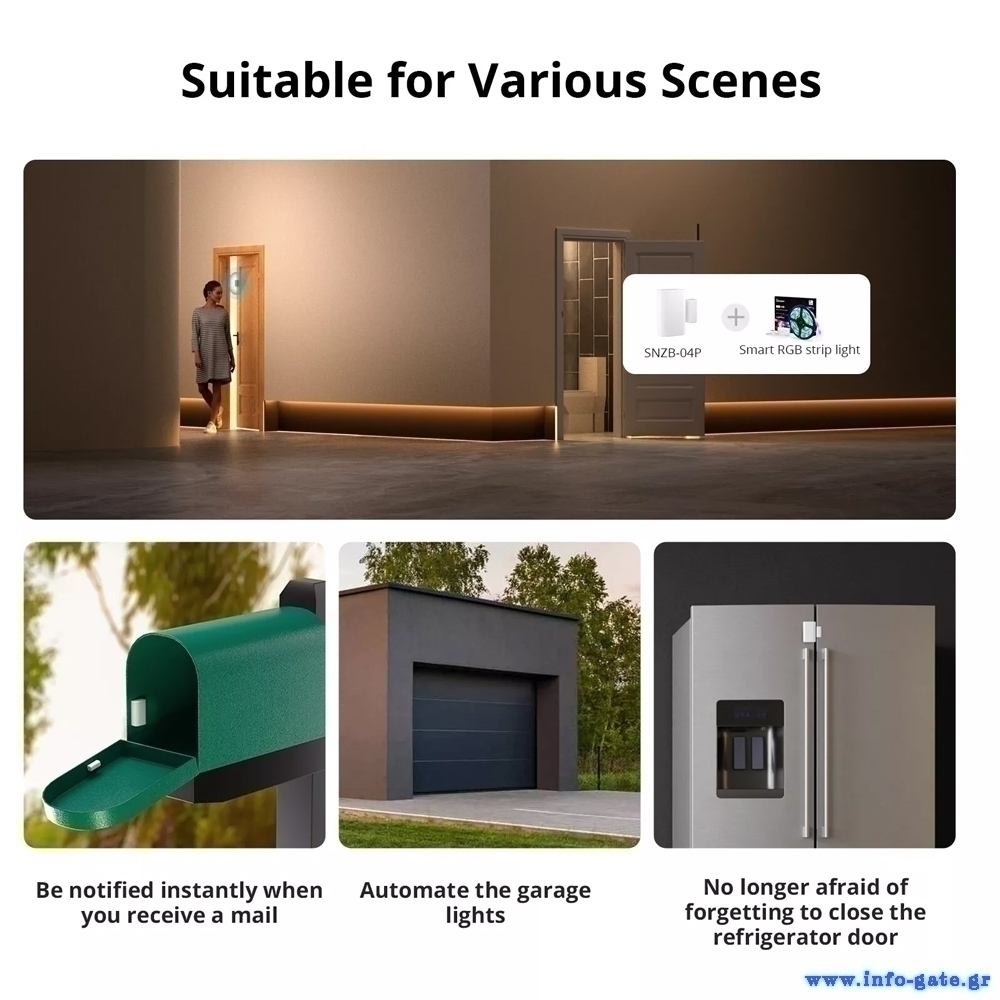 Επιπλέον, με την μαγνητική παγίδα SNZB-04P μπορείτε να δημιουργήσετε smart σκηνές, όπως για παράδειγμα το αυτόματο άνοιγμα του φωτισμού με το άνοιγμα της πόρτας.