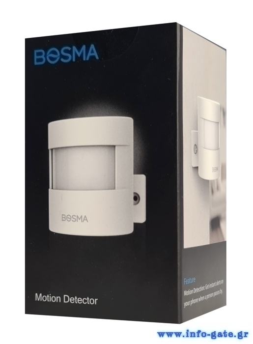 Ο ανιχνευτής κίνησης Bosma ανιχνεύει με ακρίβεια τις κινήσεις του ανθρώπινου σώματος με εμβέλεια έως 12m και γωνία κάλυψης έως 110°. Όταν ανιχνευτεί κίνηση, μια ειδοποίηση push θα σταλεί αμέσως στην smartphone συσκευή σας