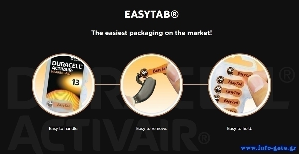 Ένα αξιοσημείωτο χαρακτηριστικό της σειράς Activair Easy Tab είναι ο σχεδιασμός τους με εύκολες και μεγάλες ετικέτες (easy tabs), που διευκολύνουν το άνοιγμα και την τοποθέτηση των μπαταριών, καθιστώντας τη χρήση τους πιο βολική.