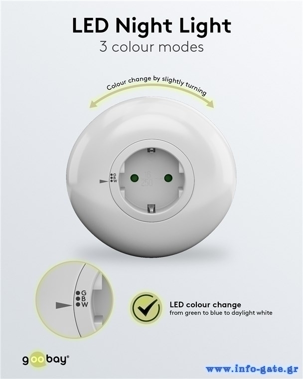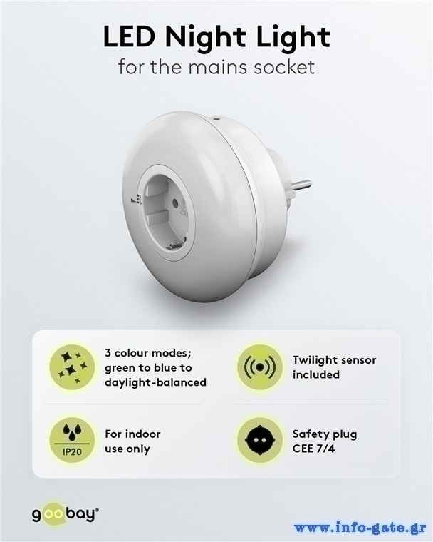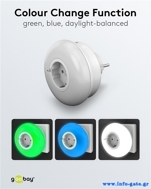 Φωτιστικό νυκτός LED της Goobay με 3 επιλογές χρώματος φωτισμού και passthrough πρίζα schuko για την αξιοποίηση της πρίζας του σπιτιού. Εξοπλίζεται με αισθητήρα φωτός για την αυτόματη ενεργοποίηση του φωτιστικού όταν η φωτεινότητα φτάσει σε επίπεδο κάτω από 21 lx.