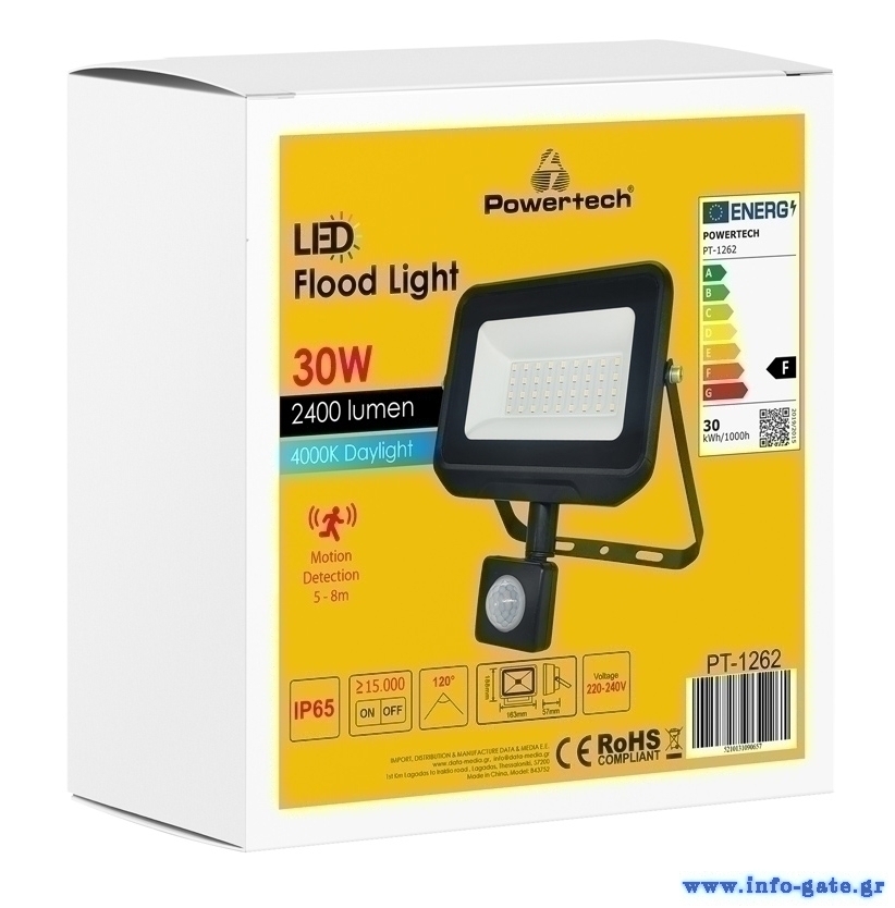Powertech LED προβολέας εξωτερικού χώρου με ισχύ 30W, φωτεινή ροή 2400 lumens και αισθητήρα κίνησης PIR με οπτικό πεδίο ανίχνευσης 120°.
