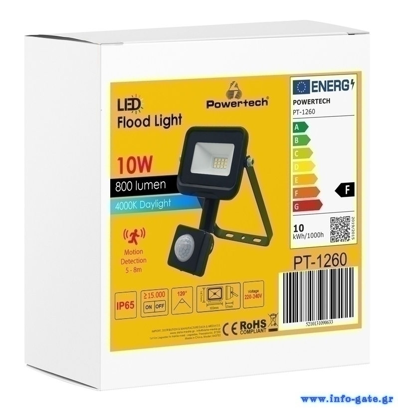 Powertech LED προβολέας εξωτερικού χώρου με ισχύ 10W, φωτεινή ροή 800 lumens και αισθητήρα κίνησης PIR με οπτικό πεδίο ανίχνευσης 120°.