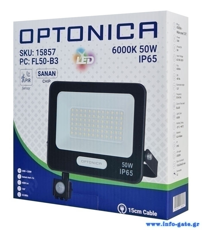 LED προβολέας της Optonica, με ισχύ 50W και αισθητήρα κίνησης PIR με οπτικό πεδίο ανίχνευσης 120°. Διαθέτει μεταλλικό περίβλημα με στεγανοποίηση επιπέδου IP65 και είναι κατάλληλος για χρήση σε εξωτερικούς χώρους.