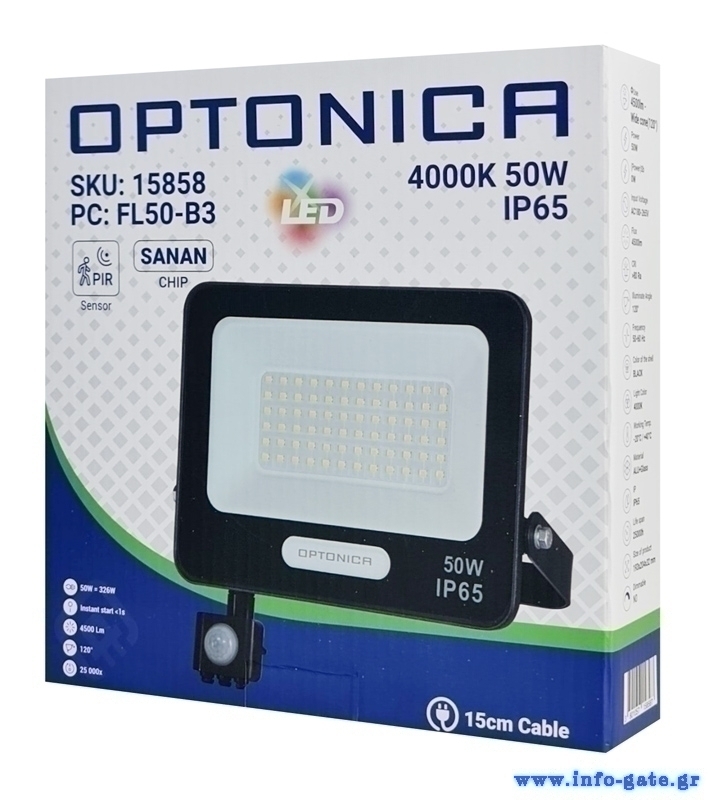 LED προβολέας της Optonica, με ισχύ 50W και αισθητήρα κίνησης PIR με οπτικό πεδίο ανίχνευσης 120°. Διαθέτει μεταλλικό περίβλημα με στεγανοποίηση επιπέδου IP65 και είναι κατάλληλος για χρήση σε εξωτερικούς χώρους.