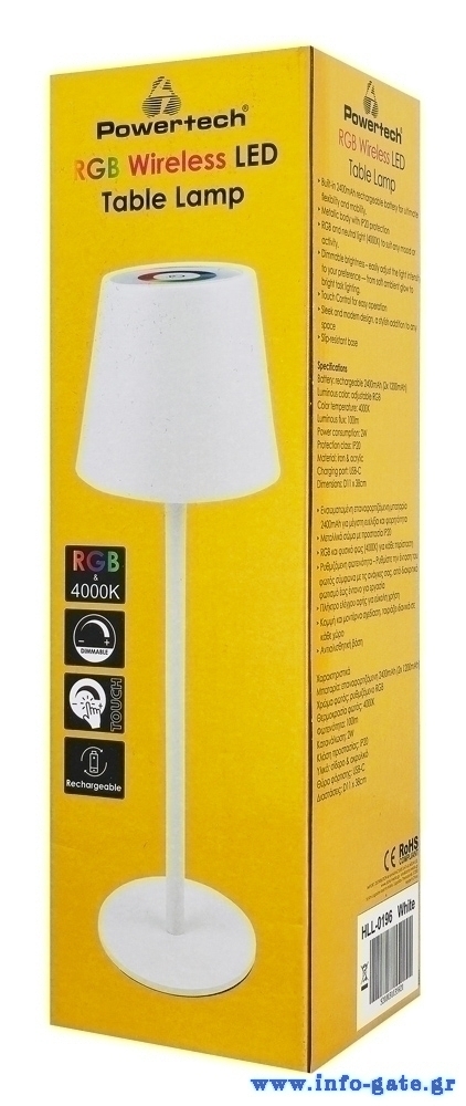 POWERTECH LED επιτραπέζιο φωτιστικό HLL-0196, RGB, ρυθμιζόμενο, επαναφορτιζόμενο, λευκό