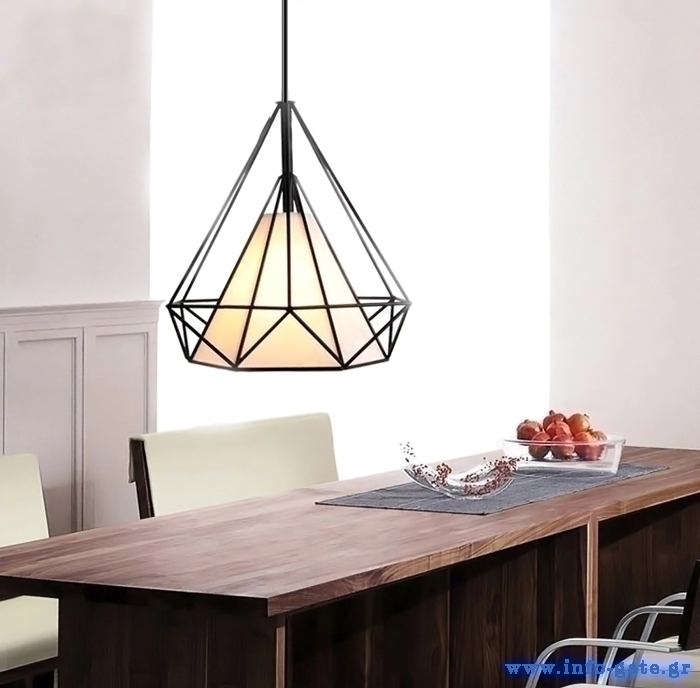 Κομψό, κρεμαστό φωτιστικό οροφής σε σχήμα διαμαντιού με προσεγμένο φινίρισμα που θα προσφέρει στον χώρο σας έναν όμορφο τόνο. Το καλαίσθητο σχέδιο του προσδίδει συμβατότητα σε κάθε χώρο, ταιριάζοντας αρμονικά είτε σε μοντέρνο είτε σε πιο παραδοσιακό περιβάλλον, ενώ το άσπρο κάλυμμα σπάει την μονοτονία. Ο σκελετός του φωτιστικού είναι κατασκευασμένος από μέταλλο και με μεγάλη προσοχή στην λεπτομέρεια, η οποία ολοκληρώνεται από την εξαιρετικής ποιότητας βαφή.