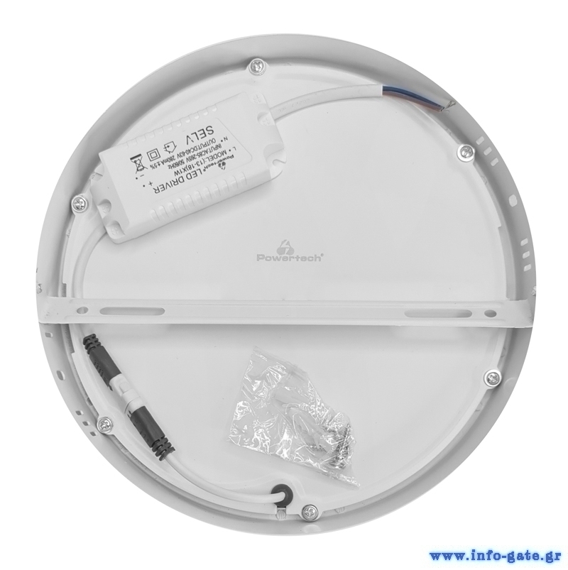 LED φωτιστικό οροφής Powertech, με ισχύ 18W και φωτεινή ροή 1820 lumens. Συνδέεται στην παροχή ρεύματος της οροφή του σπιτιού και προσφέρει εξαιρετικό φωτισμό σε συνδυασμό με καλαίσθητο και διακριτικό σχεδιασμό.