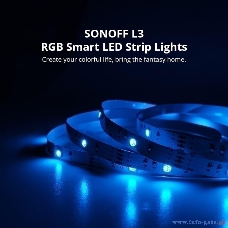 LED καλωδιοταινία L3 της Sonoff με RGB φωτισμό και μήκος 5 μέτρα. Ο έλεγχος της γίνεται απομακρυσμένα από smartphone μέσω Wi-Fi και της εφαρμογής eWeLink. Επιπλέον, υποστηρίζει φωνητικό έλεγχο με Amazon Alexa & Google Assistant.