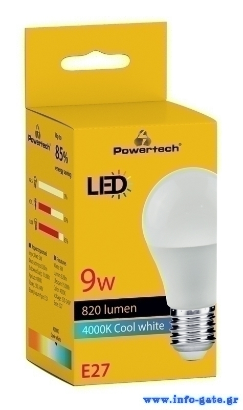 POWERTECH LED λάμπα E27-020, 9W, 4000K, E27, 820lm