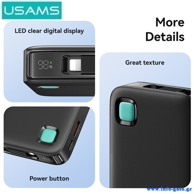 Με το power bank της Usams η χαμηλή στάθμη της μπαταρίας δεν θα αποτελεί άλλο πρόβλημα, καθώς σας επιτρέπει να φορτίσετε smartphone, tablet, ακουστικά και άλλες φορητές συσκευές οπού και αν βρίσκεστε.