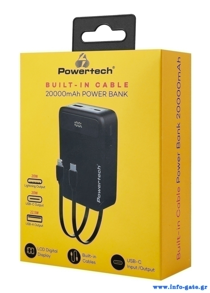 POWERTECH power bank PT-1504 με καλώδια & οθόνη, 20000mah, 22.5W, μαύρο