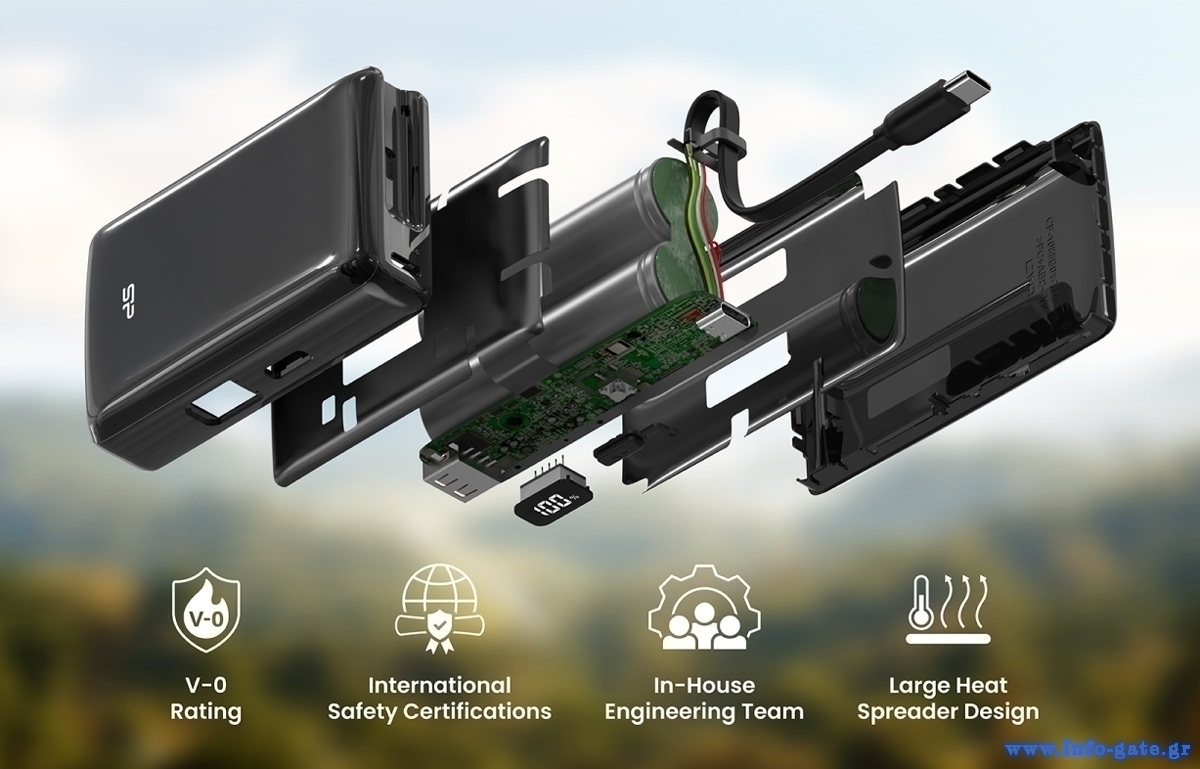 Η φόρτιση του power bank γίνεται μέσω της USB-C θύρας ή ενσωματωμένου καλωδίου και εξοπλίζεται με ψηφιακή οθόνη για την ένδειξη κατάστασης της μπαταρίας.