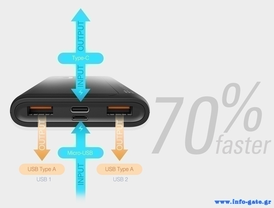 -υποστηρίζει γρήγορη φόρτιση 18W (PD) μέσω Type-C και QC3.0 μέσω USB