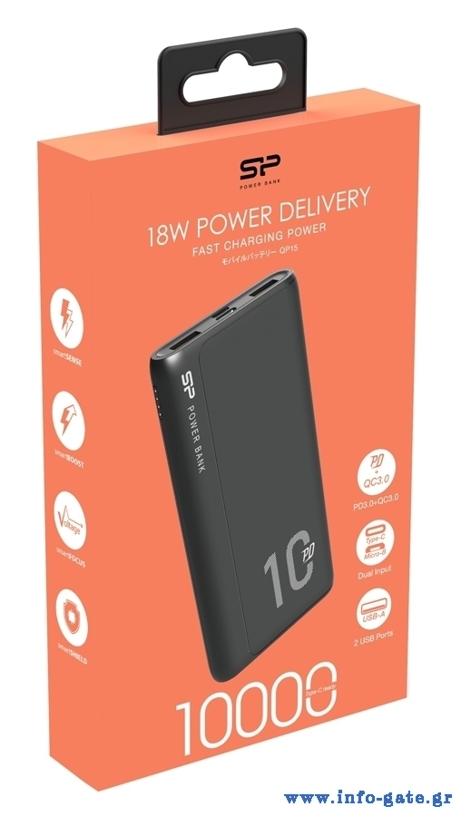 SILICON POWER power bank QP15, 10000mAh, 2x USB & USB Type-C, 3A, μαύρο