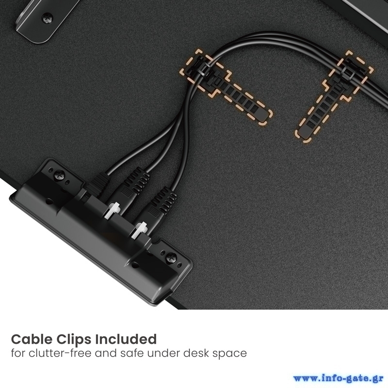 Διαθέτει ρυθμιζόμενο πλάτος, γεγονός που επιτρέπει την προσαρμογή επιφανειών εργασίας σε διάφορα σχήματα και μεγέθη.