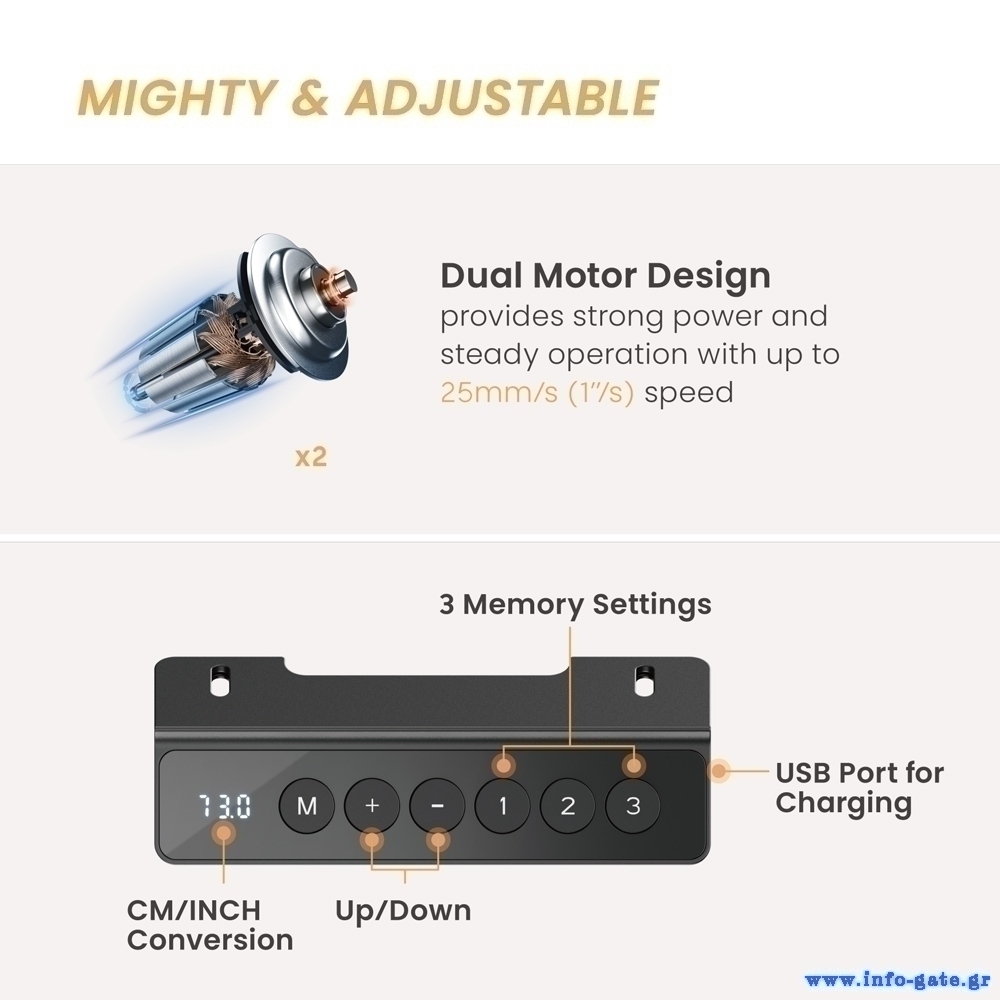Η βάση διαθέτει ισχυρό διπλό μοτέρ που εξασφαλίζει ομαλή και σταθερή κίνηση κατά την ρύθμιση του ύψους.