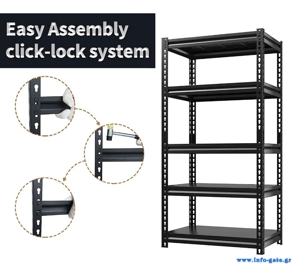 Μεταλλική ραφιέρα με 5 ράφια λαναρισμένης μοριοσανίδας μαύρου γυαλιστερού χρώματος και από τις 2 πλευρές, με πάχους 4mm που προσφέρουν μεγάλη αντοχή βάρους έως 175kg ανά ράφι.