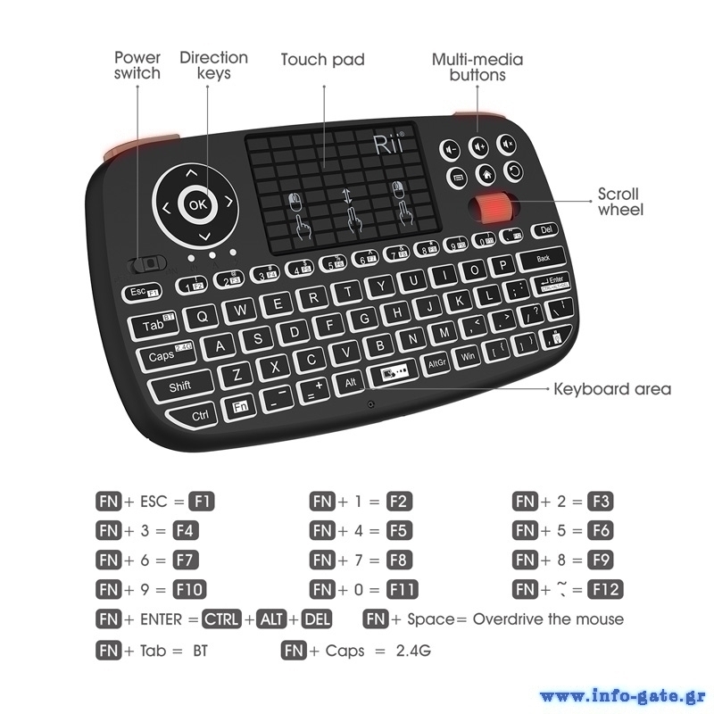 RIITEK ασύρματο mini πληκτρολόγιο i4, backlit, Bluetooth & 2.4GHz, μαύρο