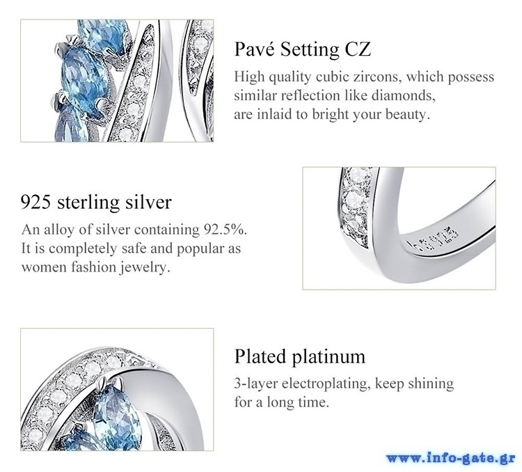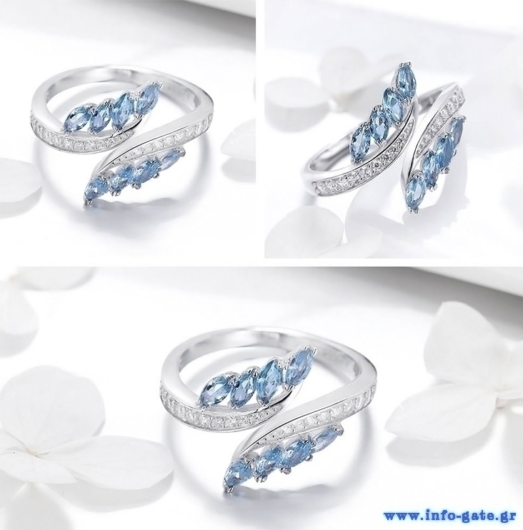 Κομψό δαχτυλίδι σε σχέδιο φύλλου ιτιάς, διακοσμημένο με αστραφτερή κυβική ζιρκόνια, λευκού και μπλε χρώματος, η οποία προσφέρει μοναδική λάμψη στο κόσμημα.